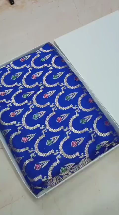 Drape yourself in timeless elegance with this exclusive Banarasi handloom Katan silk saree, crafted with intricate artistry and heritage weaving. Featuring pure gold zari and delicate Meenakari detailing, the saree boasts full-body work with rich floral and paisley motifs that exude regality. The royal blue base highlights the brilliance of the zari, making it a perfect choice for weddings, festive occasions, and grand celebrations.