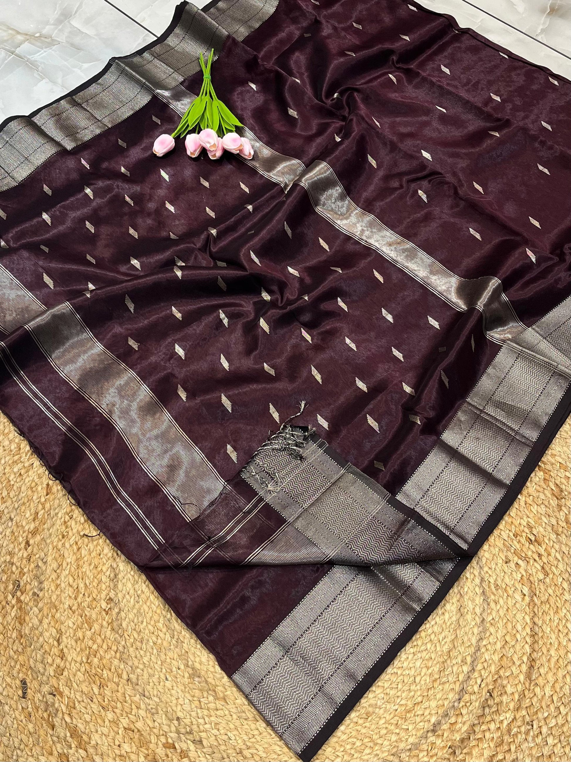Drape yourself in timeless elegance with this intricately woven saree, adorned with detailed floral motifs and shimmering zari accents. The fabric flows beautifully, combining comfort with sophistication. Perfect for weddings, festive occasions, and special gatherings, it offers a refined charm that pairs effortlessly with traditional or contemporary jewelry.
